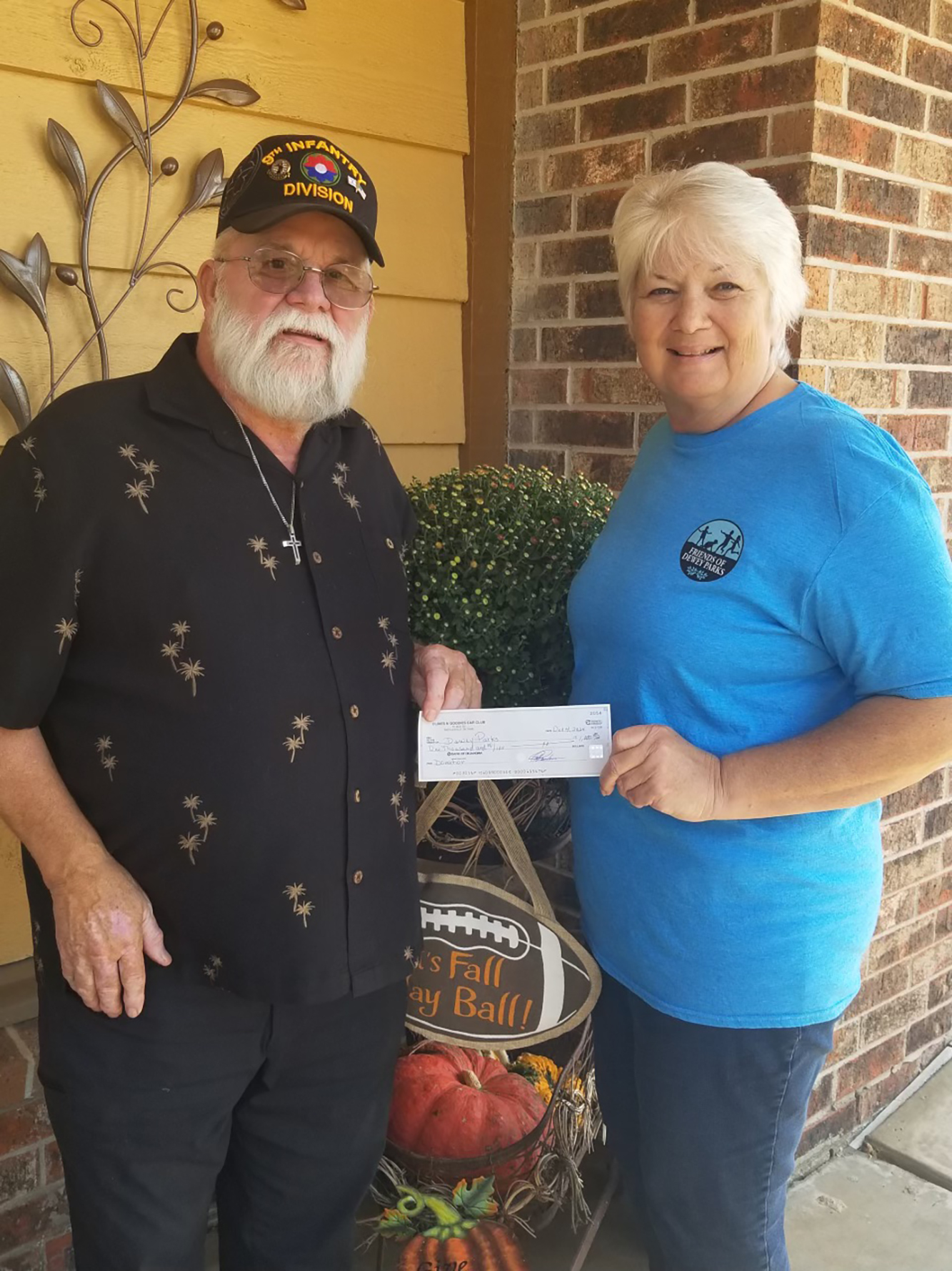 FODP President Cindy Bray accepting a check for $7,500 from City of Dewey Mayor Tom Hays.